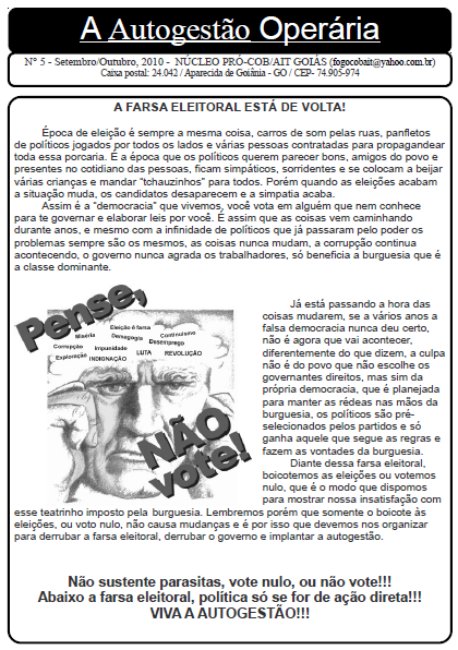 Diante dessa farsa eleitoral, boicotemos as eleições ou votemos nulo, que é o modo que dispomos para mostrar nossa insatisfação com esse teatrinho imposto pela burguesia. Lembremos porém que somente o boicote às
