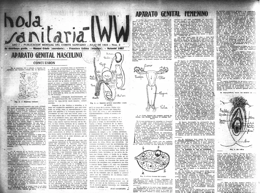 El documento que se entrega a continuación, corresponde a los dos primeros números de la Hoja Sanitaria , repartidos de manera gratuita entre junio y julio de 1924. El primer artículo publicado llevó por título “Lucha contra insectos”, basado en la Cartilla aprobada por la Académie de Médecine de París en diciembre de 1915. Este presenta ilustraciones del piojo de la cabeza (pediculus capitis) hembra y macho, ladilla (phthirius pubis) o piojo del pubis, aumentados cada uno por 25 veces; así como también del chinche (cimex lectularius), aumentado por 15 veces. En él se puede leer: “Los piojos, las pulgas y los chinches son parásitos a quienes se cree inofensivos y que en realidad son muy peligrosos, porque pueden trasmitir enfermedades muy graves y terribles (…) Los piojos son un signo de suciedad y de negligencia personal (…) El piojo de la cabeza no es mucho de temer para las personas que usan el pelo cortado al ras, para desembarazarse de él cuando se le tiene, se friccionan los cabellos con petróleo, con bencina o con esencia mineral. Se envuelve la cabeza con un lienzo cualquiera, para dar tiempo de obrar al remedio. Al cabo de 1 hora todos los piojos han muerto, así como sus liendres. Se cortan entonces los cabellos con la máquina y se les quema, y se lava la cabeza con jabón”. Propone tratamientos en base a pomadas y ungüentos que se pueden encontrar “en las boticas sin necesidad de receta”. La profilaxis recomendada es “el aseo corporal, y los baños de ducha y los baños jabonosos con la frecuencia posible”.